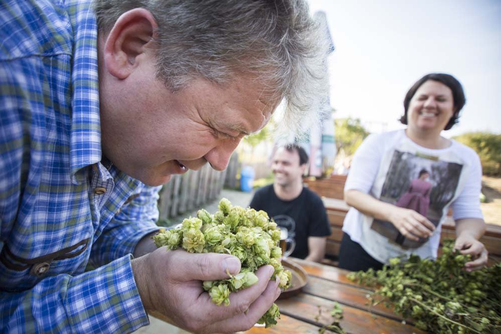 Bevor es allerdings in das Sudhaus ging, durften die brasilianischen Freunde noch beim Hopfenzupfen helfen. Die Sorte Cascade, ein besonders fruchtig riechender Hopfen, wurde in diesem Jahr zum ersten Mal im Garten oberhalb der Brauerei selbst angebaut. Beim Collaboration Brew Rauchbock vor vier Jahren wurde auch erstmals Hopfen aus dem eigenen Garten verwendet. Mit einem Lachen im Gesicht erinnerte man sich an den damaligen gemeinsamen Brautag und auch die Idee hinter dem Rauchbock: "Wir lieben Rauchbier und das Bamberger Land." Und diese Liebe darf man auch bald wieder schmecken.